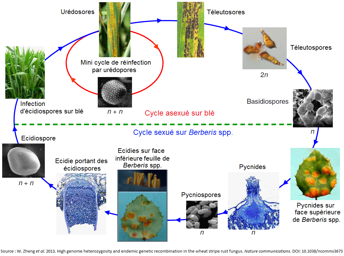 Figure 5 : cycles de reproduction sexuée et asexuée de Puccinia striiformis. Source : W. Zheng et al. 2013. High genome heterozygosity and endemic genetic recombination in the stripe rust fungus. Nature communications. DOI: 10.1038/ncomms3673.