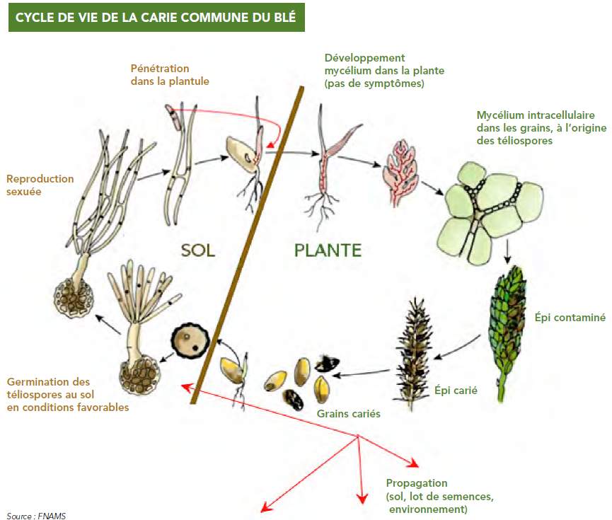 La carie du blé est une maladie cryptogamique des céréales qui se transmet principalement par la semence. Elle peut également se transmettre par le sol jusqu’à cinq années après une culture contaminée. La contamination a lieu entre la germination du grain et le stade deux feuilles, stade auquel la plante devient résistante. Dès que la plante est contaminée, il est trop tard pour agir. Le champignon va se développer discrètement au sein de la plante jusqu’au remplissage des grains. C’est à ce stade de développement de la culture que les symptômes les plus visibles apparaitront : épis ébouriffés, grains immatures vert foncé et remplis d’une poudre noire.