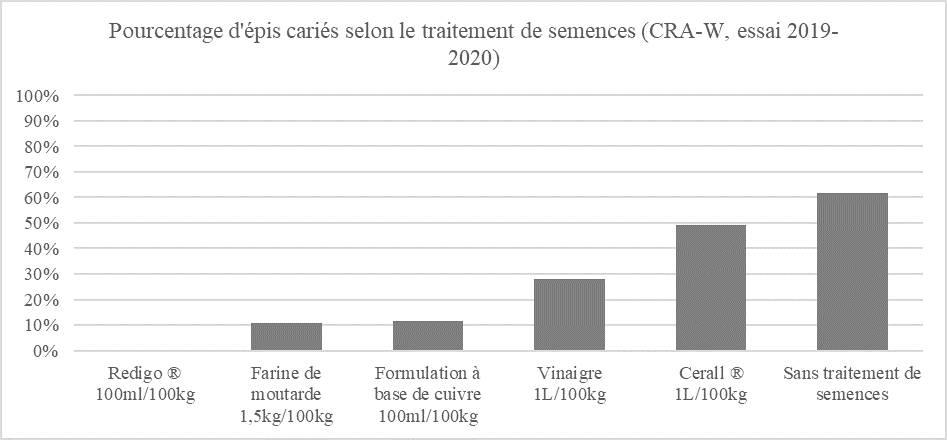 Ces traitements de semences agréés en agriculture biologique ne fournissent donc pas une protection suffisante (<99%) pour enrayer la propagation de la carie. Ceci a été démontré dans des essais du CRAW menés en 2020 (Figure 4). Ces traitements sont donc à combiner avec d’autres méthodes pour atteindre le niveau d’efficacité nécessaire. Il est donc très important de vérifier soigneusement l’état sanitaire des semences utilisées, de trier celles-ci, de pratiquer un brossage des grains lorsque c’est possible et, par précaution, d’effectuer un traitement avec un produit agréé.