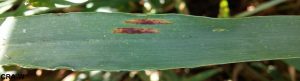 Les symptômes de la maladie se présentent sous forme de nécroses brun foncé, entourées d’un halo jaune et visibles sur les deux faces de la feuille.  Les nécroses sont bien souvent de forme longitudinale et disposées le long des nervures.  Un réseau brun foncé en forme d’échelle se distingue au sein de ces lésions.  La maladie se répartit de façon homogène dans la parcelle atteinte.  L’infection monte du bas vers le haut de la plante.