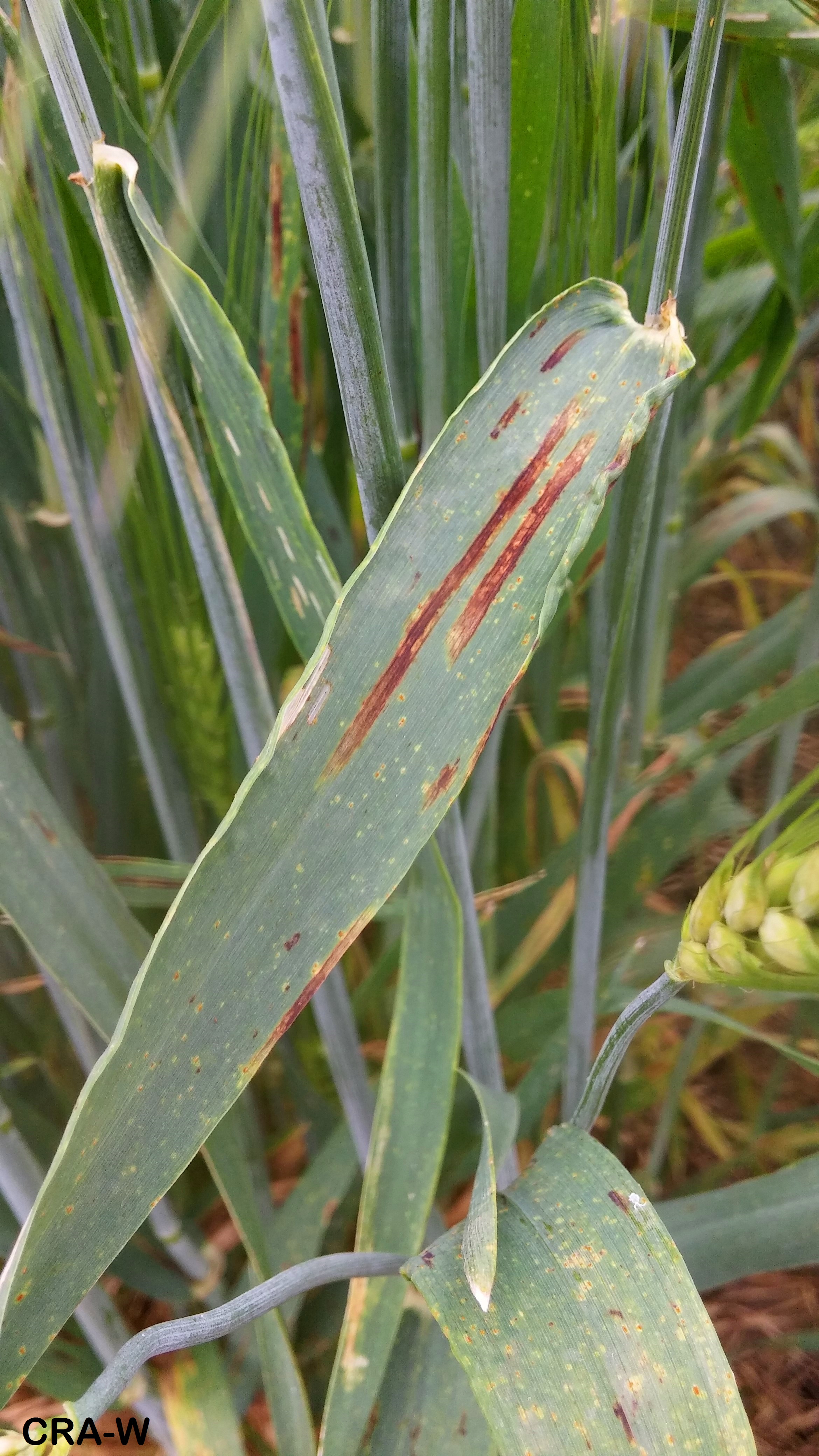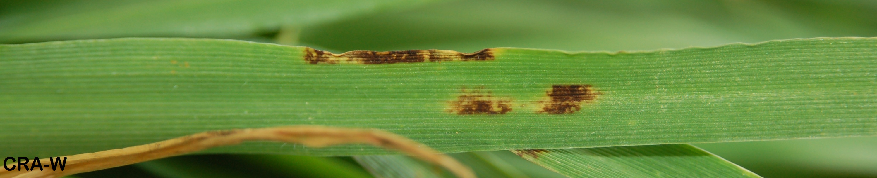 Symptômes de l'helminthosporiose sur les derniers étages foliaires. Photo prise le 31/05/2018. Source : CRA-W.